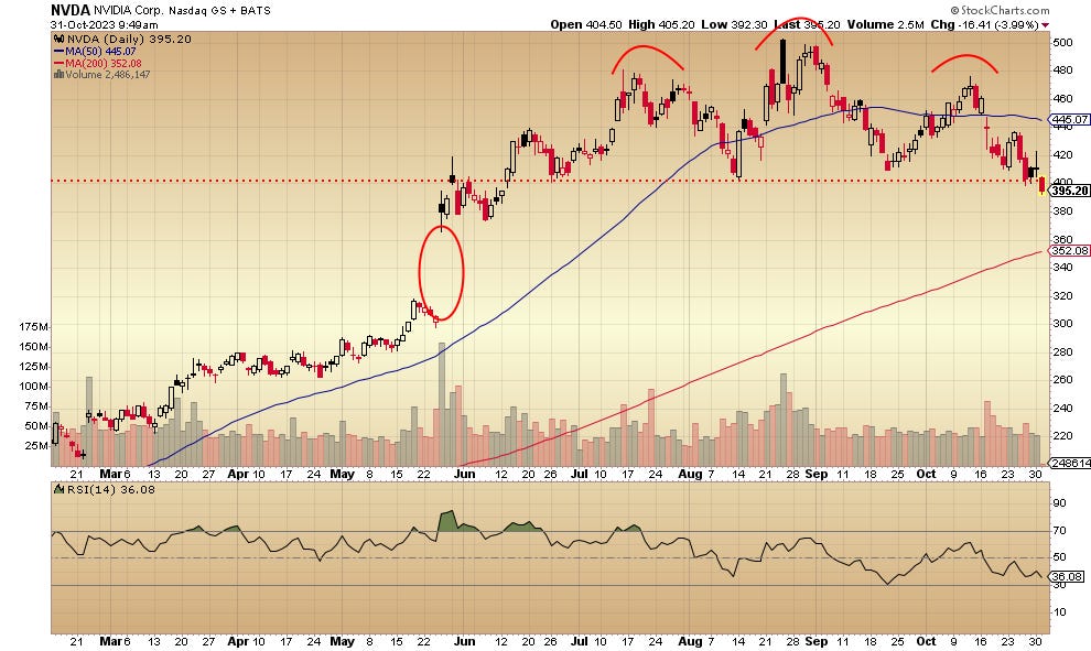 Classic Chart PatternNVIDIA daily John NavinOct 31, 202311ShareThe apparent head and shoulders top. The break of previous support (red dotted line). The gap up from the May buying frenzy (red circled). Not investment advice. For educational purposes only.