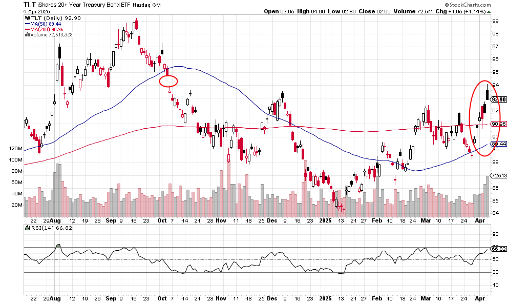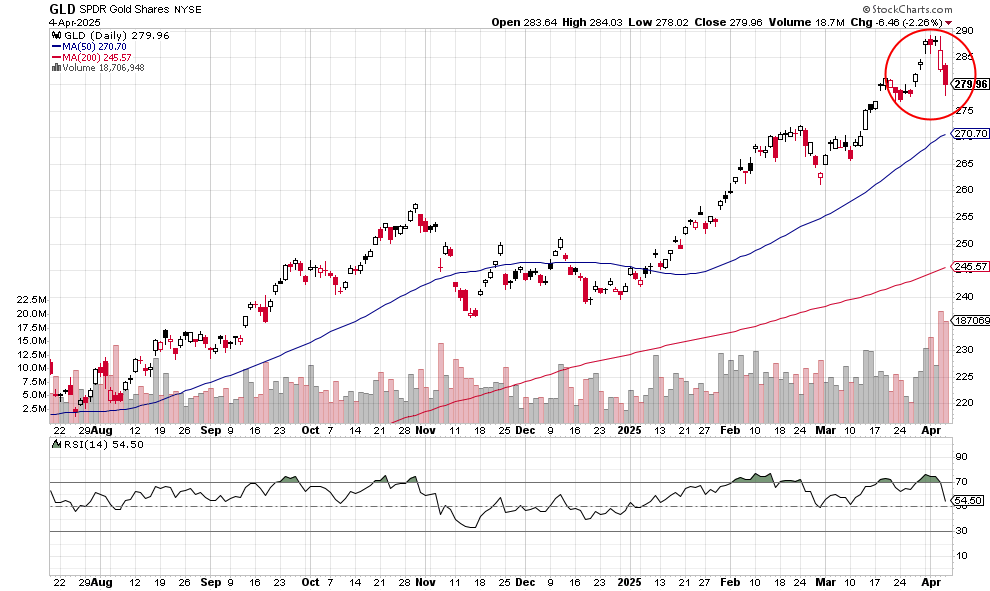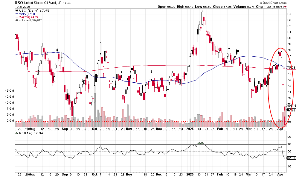 The 5.95% drop is the closing price — earlier in the session, the fund slid below the September 2024 low. The two big gaps down this week are extraordinary. The 50-day moving average is about to cross below the 200-day moving average. Note how the 50-day has been trending downward since the beginning of March, a warning.