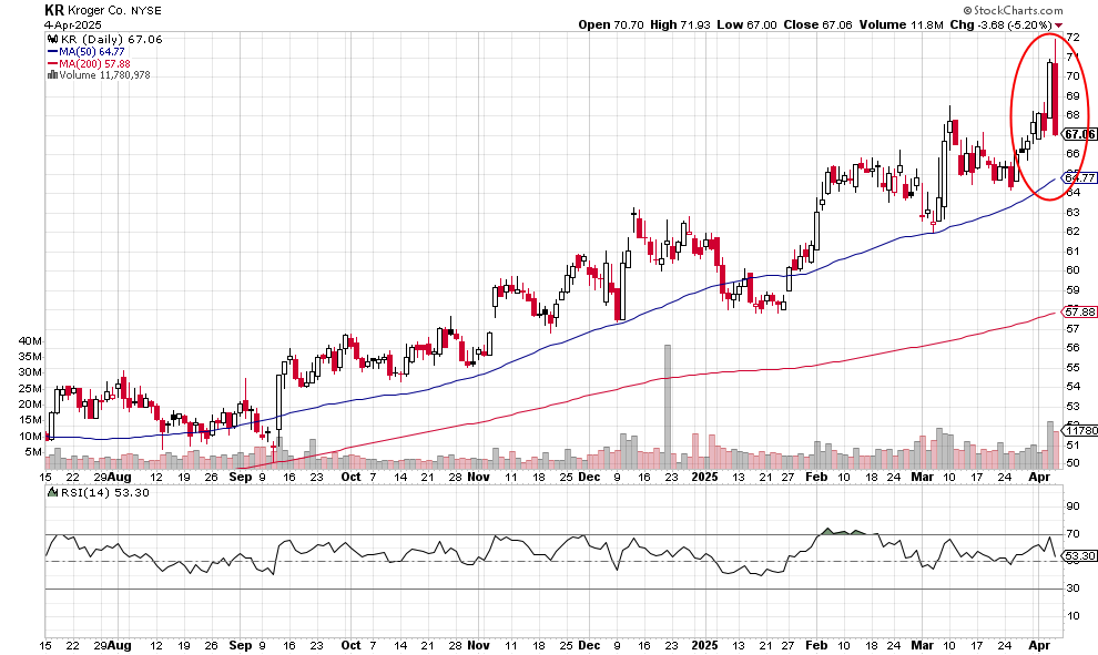 Today’s loss of 5.20% for the big grocery store chain leaves a bearish engulfing candlestick: a higher high (and a new high) than the previous day and a lower low than the previous day. Sometimes this is an indication of trend reversal. Note that the 50-day and 200-day moving averages continue to trend upward.