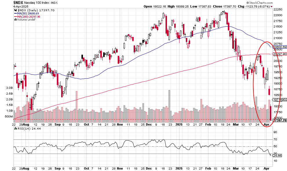 Today’s 5.97% slide takes the index below the early August 2024 low. With a gap down on Thursday and a gap down on Friday, investors clearly want out and quickly. Look for the 50-day moving average to cross below the 200-day moving average soon.