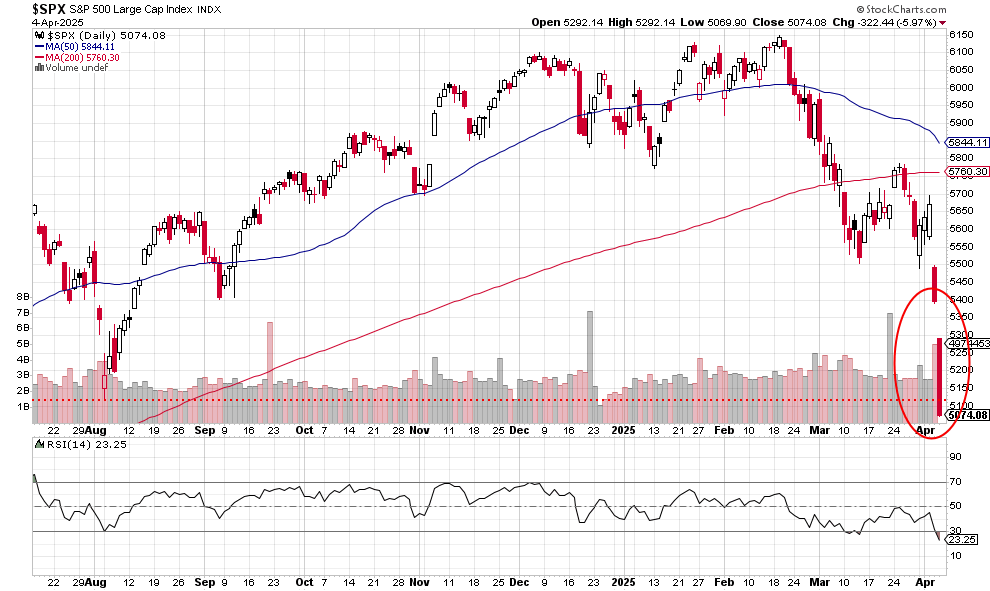 The 6.07% drop takes the index below the August 2024 lows, not considered likely just a few weeks ago. The two gaps down in a row demonstrate the emotional quality of the trading late this week. I would say that the 50-day moving average looks on track to cross below the 200-day moving average — maybe next week.