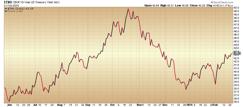More importantly for markets as a whole was the small but steady upward trend in the yield of the U. S. Treasury’s 10-Year Note. Here’s the daily chart showing basis points: