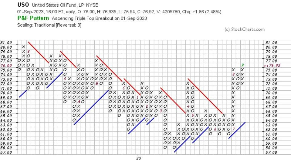 For a more complete perspective, here’s how the point-and-figure chart looks for the United States Oil Fund:
