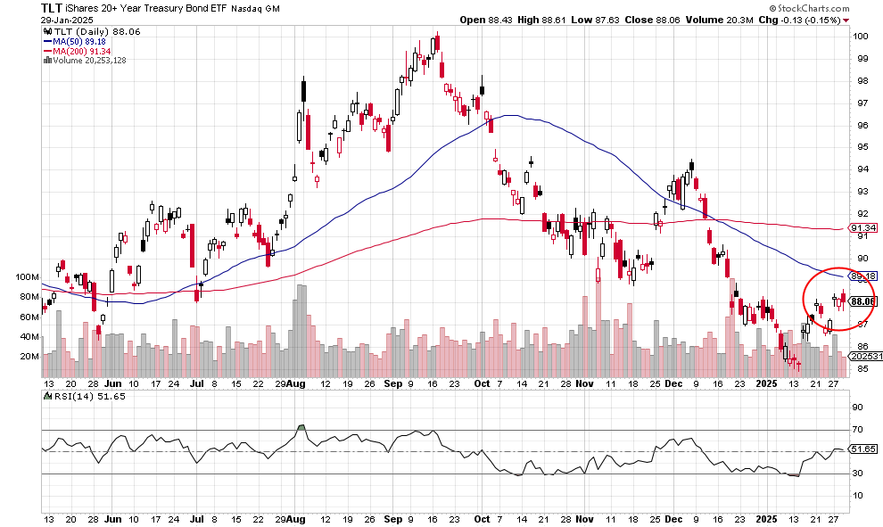 Bonds go higher early and then finish the day -.15%. Bulls would want to see this make it back over the 50-day moving average sometime soon.